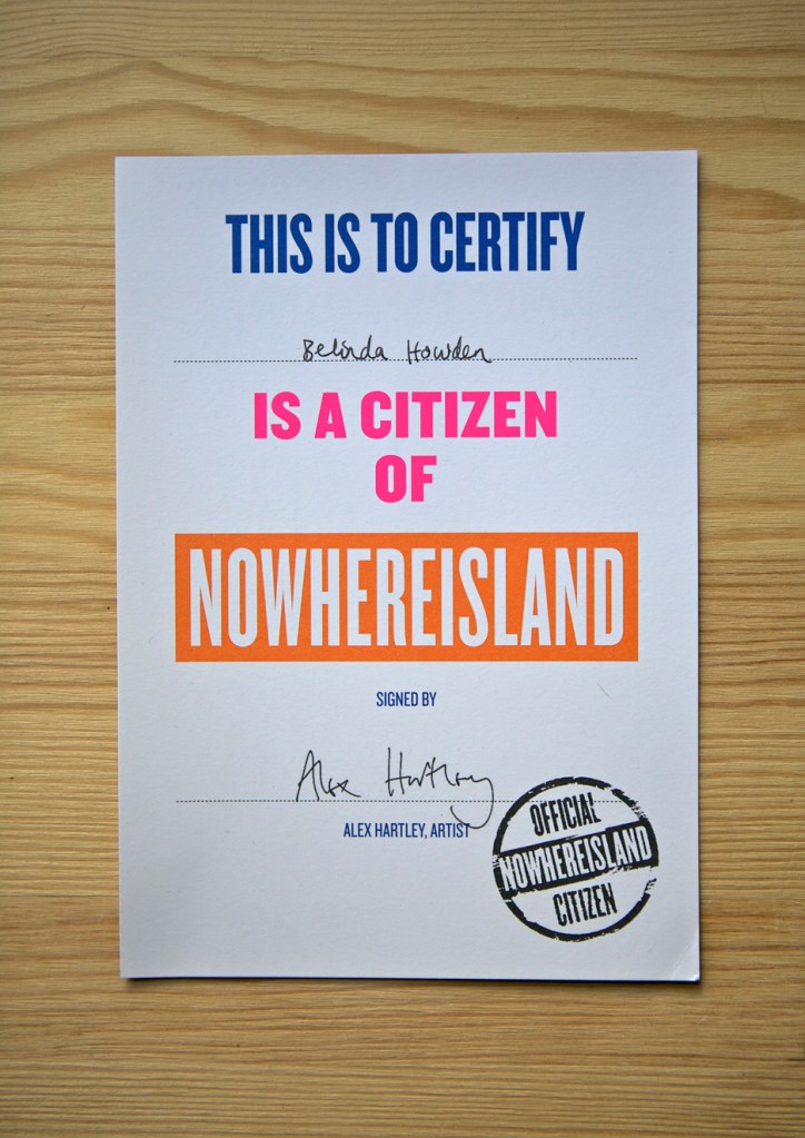 Nowhereisland is an artistic project by British artist Alex Hartley, made in 2012. It was an artwork that grew from the proposition ‘what if an Arctic island travelled south?’1 The fundamental premise of the project was to create the world’s newest nation, a borderless country with citizenship open to all.