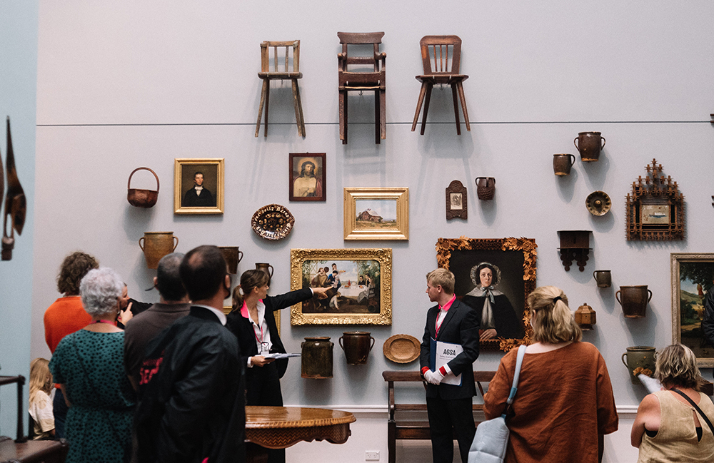 Nutritional Index was conceived as part of a wider exhibition program, Reaching Out, initiated in 2021 by Tutti Arts. South Australian artists Kurt Bosecke and Emmaline Zanelli were invited to respond to the permanent collection of The Art Gallery of South Australia and granted rare behind-the-scenes access to the gallery. They met and interviewed staff across all departments of the organisation, from conservators to curators to security staff. The results of the artists’ research were a suite of humourous, performative guided tours, Nutritional Index, presented as part of the 2022 Fringe Festival. The tours won the 2022 Fringe BankSA’s Best Art and Visual Design award.