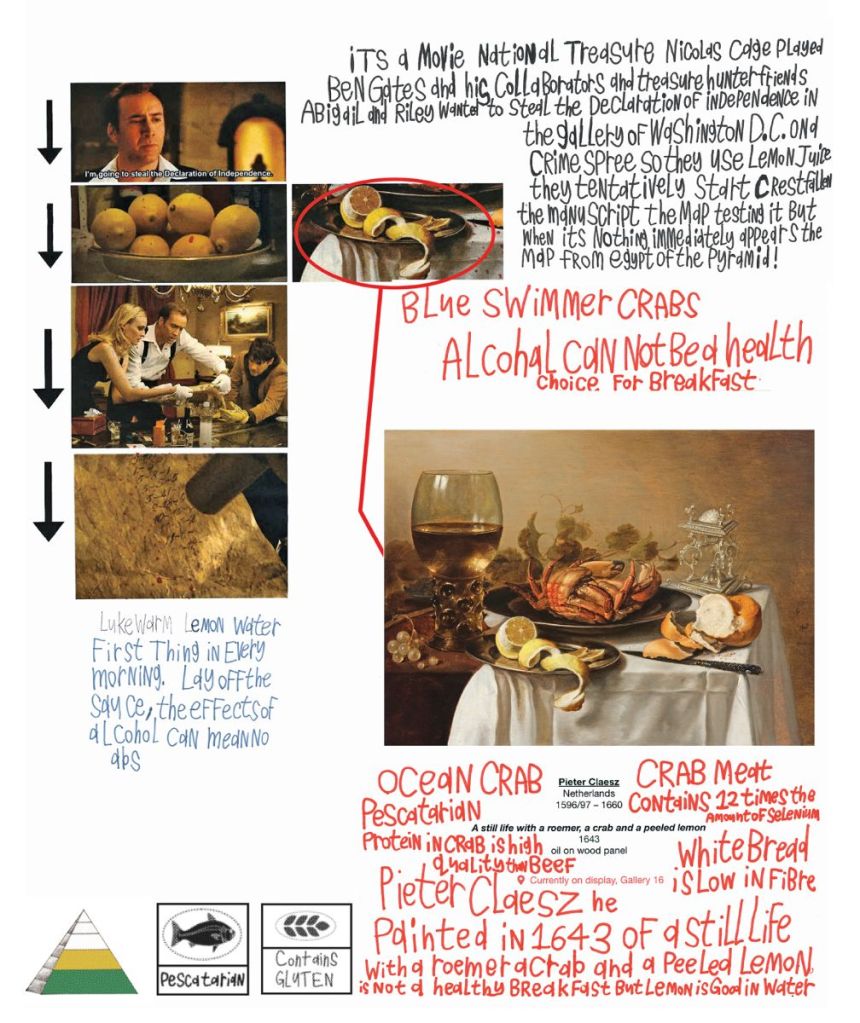 [Nutritional Index] sees Kurt and I play hybrid characters – nutritionists and art historians from the Australian Bureau of Cultural Dietetics Eating For Good Health (A.B.C.D.E.F.G.H.). Throughout the tour, Kurt and I speak to several artworks on display within AGSA’s galleries, using nutrition as a lens through which to understand the works in a different light. Audience members are issued with level 3 security clearance lanyards upon arrival, and we are accompanied by 4 security staff (played by members of The Bait Fridge), and after 1 hour of moving through the galleries, we finish the tour with a Nutribullet smoothie using ingredients referencing the artworks throughout the tour.1
